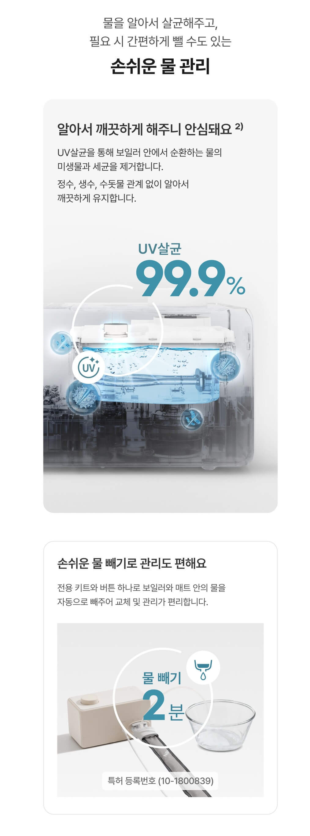 온수매트의 관리가 어려운 이유 중 하나는 바로 내부에 채워진 물관리 때문입니다. 채워둔 물은 셀프이온케어 기술을 통해 보일러와 매트를 전기분해살균수가 주기적으로 순환하며 99.9%의 살균상태를 유지해주고 물을 뺄 땐 자동물빼기 기능을 이용해 매트를 움직이지 않아도 빠르고 간편하게 빼낼 수 있습니다.