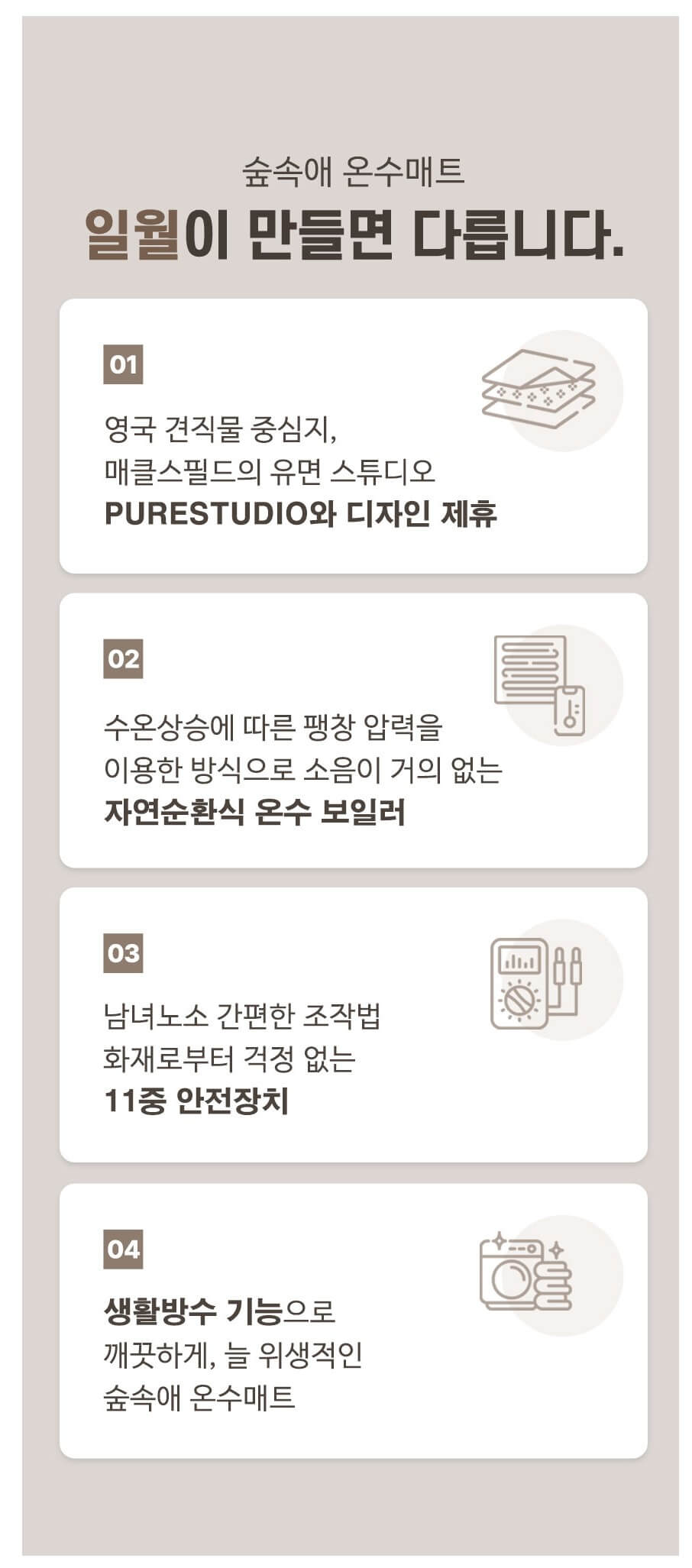 보일러에 사용된 모터는 BLDC의 강력한 저소음 모터를 탑재해 야간에 사용하셔도 조용함을 유지하고 EMF 인증까지 받아 전자파 걱정없이 사용하실 수 있습니다. 보일러와 매트를 연결할 때는 원터치로 손쉽게 탈착하면서 물샐 걱정없는 듀얼 퀵커플러를 적용해 사용 중 물이 흐르는 부분까지 완벽하게 커버했습니다.