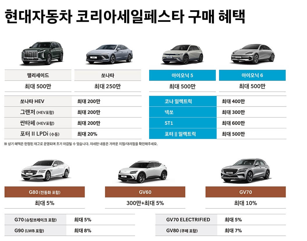 2024년 코리아 세일 페스타를 맞아 현대, 기아, 제네시스는 11월 1일 금요일부터 11월 29일 금요일까지 한달 동안 올해 최대 수준의 할인 프로모션이 진행니다.